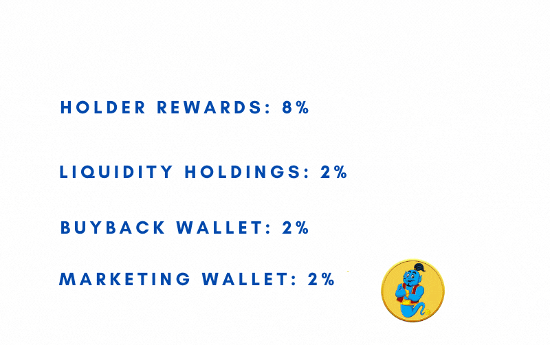 ✅ Holder Rewards: 8% ✅ Liquidity Holdings: 2% ✅ Buy-Back + Burn Wallet: 2% ✅ Marketing Wallet: 2%