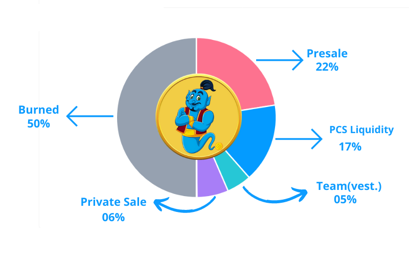 The following Tokenomics chart shows how the total supply of $Genie Coins will be distributed among various sections.
